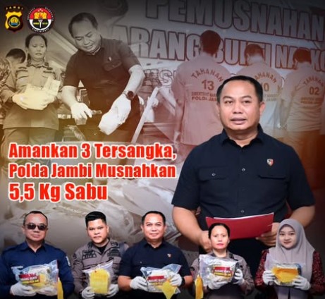 Amankan 3 Tersangka, Polda Jambi Musnahkan 5,5 Kg Sabu