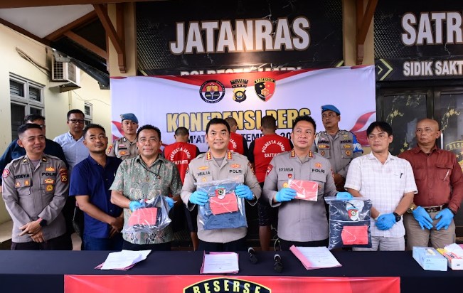 Kabid Humas Polda Jambi Kombes Pol. Mulia Prianto di dampingi oleh Kapolresta Jambi Kombes Pol. Boy Siregar melaksanakan konferensi pers ungkap kasus pencurian dengan pemberatan yang dilakukan saat aksi unjuk rasa DPR pada tanggal 29 Agustus 2025.