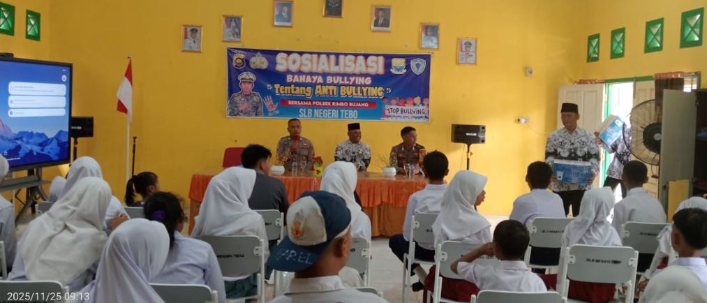 POLRES TEBO – Dalam rangka memperkuat pencegahan kekerasan terhadap anak di lingkungan sekolah, Polsek Rimbo Bujang menggelar Sosialisasi Bahaya Bullying di SLB Negeri Tebo, Kecamatan Rimbo Bujang, pada Selasa (25/11/2025) sekira pukul 09.00 WIB.
